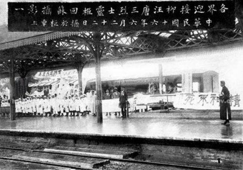 1927年6月汪伯乐等烈士灵柩由宁运苏,各界代表在雨中迎候。
