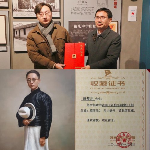 当日,爱心画家酒子辰老师怀着对革命先烈的崇敬之情,郑重将精心创作的汪伯乐烈士油画捐赠给博物馆。画作以艺术笔触生动还原了烈士刚毅坚定的精神风采,为红色馆藏增添了鲜活的精神载体,让观众得以直观感受先烈的革命气节。苏州革命博物馆馆长徐海明为酒子辰老师颁发捐赠证书,对其无偿捐赠、传承红色文化的善举深表谢意,强调这幅油画将与《汪烈士圹志》碑相映成辉,共同成为开展红色教育的生动教材,助力革命精神代代相传。